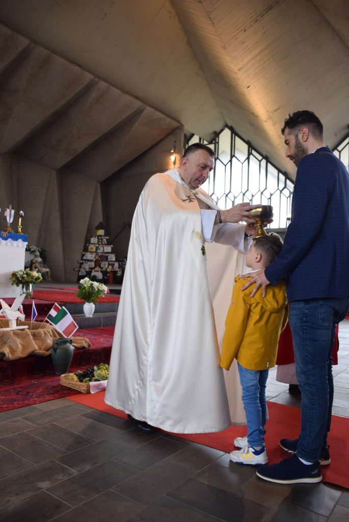 Cette messe de Pentecôte est aussi une belle occasion d’observer les différentes pratiques et coutumes, comme par exemple ce geste du père Abdallah lors de la communion ; il dépose la patène sur la tête des enfants qui ne peuvent pas encore communier (photo ci-contre). Il est émouvant aussi de voir un prêtre polonais ou ukrainien donner la communion aux membres des autres communautés.