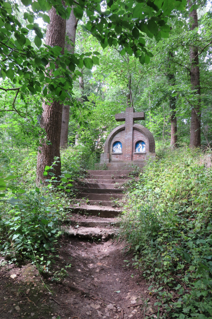 En 1905, c’est un chemin de croix qui trouve résidence dans la colline avec des stations marquées de grandes croix formées de troncs de chêne d’abord, et ensuite construites en briques abritant de remarquables bas-reliefs. Les Pères du Saint Sacrement avaient projeté de construire le plus grand chemin de croix du monde, avec des statues de 4 mètres de haut. L’oeuvre fut confiée à l’artiste J. Jacobs de Malines. Après trois stations, le projet est abandonné, faute de moyens.