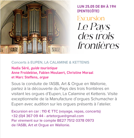 Sous la conduite de l’ASBL Art & Orgue en Wallonie, partez à la découverte du Pays des trois frontières en visitant les orgues d’Eupen, La Calamine et Kettenis. Visite exceptionnelle de la Manufacture d’orgues Schumacher à Eupen avec audition sur les orgues présents à l’atelier.
