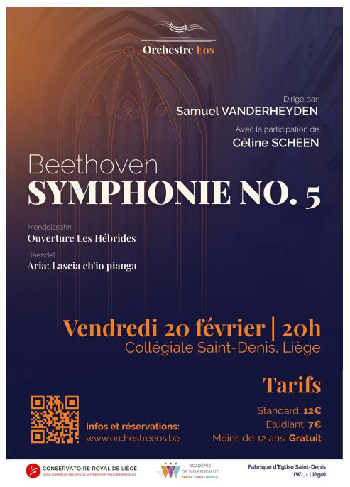 Un nouvel orchestre de jeunes est en train de se constituer à Liège, sous la conduite de Samuel VANDERHEYDEN, élève de la classe de direction d’orchestre du Conservatoire Royal de Liège. Cette formation a pris pour nom « Eos ». Les musiciens de cet orchestre, issus de conservatoires belges, mais aussi de conservatoires des pays limitrophes (France, Pays-Bas et Luxembourg), se réuniront durant la première semaine du congé du carnaval, afin de mettre au point le programme qu’ils présenteront, à la collégiale Saint-Denis, le vendredi 20 février à 20H.