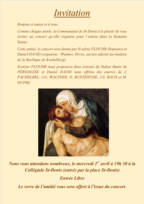 Invitation au concert organisé pour l'entrée en Semaine Sainte, mercredi 1er avril, à 19h30, à la collégiale Saint-Denis