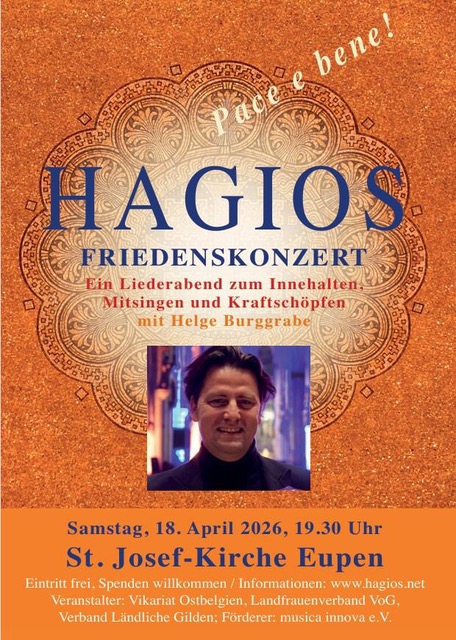 Herzliche Einladung zum HAGIOS Friedenskonzert, am Samstag, den 18. April 2026, 19.30 Uhr in der Pfarrkirche St. Josef, Eupen, Unterstadt