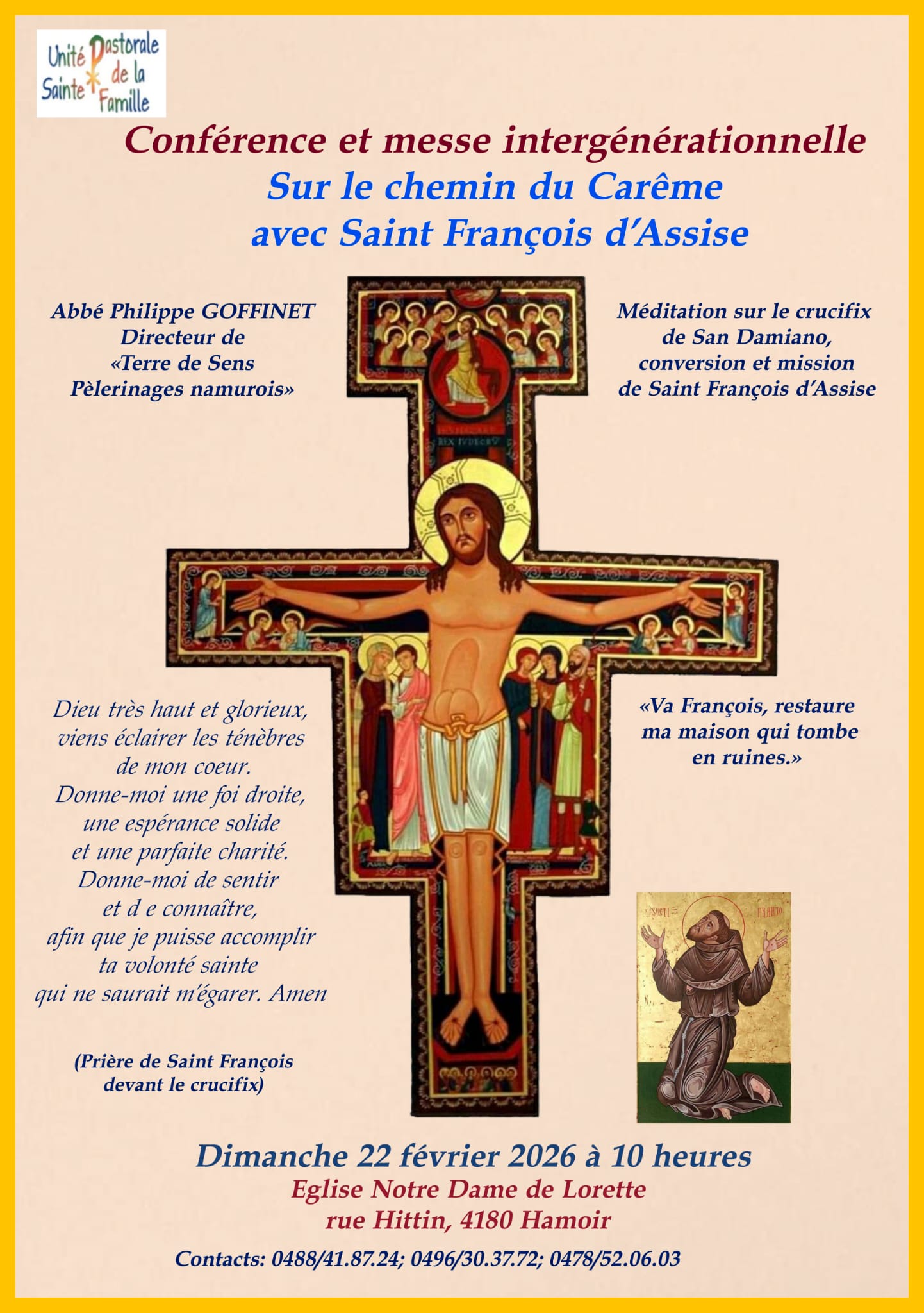 Le dimanche 22 février, à 10h, l'église Notre Dame de Lorette, à Hamoir, vous accueille pour assister à une conférence et à une messe intergénérationnelle: Sur le chemin du Carême avec saint François d'Assise.