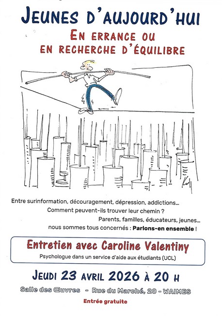 Conscients de la nécessité d’une information sérieuse et documentée sur le sujet, les responsables des communautés paroissiales de la commune de Waimes ont le plaisir de vous inviter à une soirée exceptionnelle en compagnie de Caroline Valentiny, psychologue, pour explorer un thème qui nous touche tous : Jeunes d’aujourd’hui en errance ou en recherche d’équilibre.