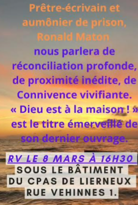 Le 8 mars, à 16h30, le prêtre, écrivain et aumônier de prison Ronald Maton donnera une conférence à Lierneux: "Quelle est l'originalité de l'Evangile".
