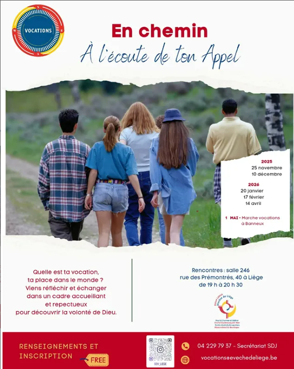Le service des vocations du diocèse de Liège propose aux jeunes qui ont entre 16 et 30 ans et qui ressentent l'appel de Dieu de se retrouver pour échanger.