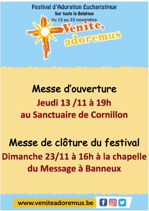 La messe d’ouverture du festival sera célébrée par notre évêque Mgr Jean-Pierre Delville au sanctuaire de Cornillon jeudi 13 novembre à 19h. Elle sera suivie par une veillée de prière et une nuit d'adoration animée par les jeunes de Cornillon.