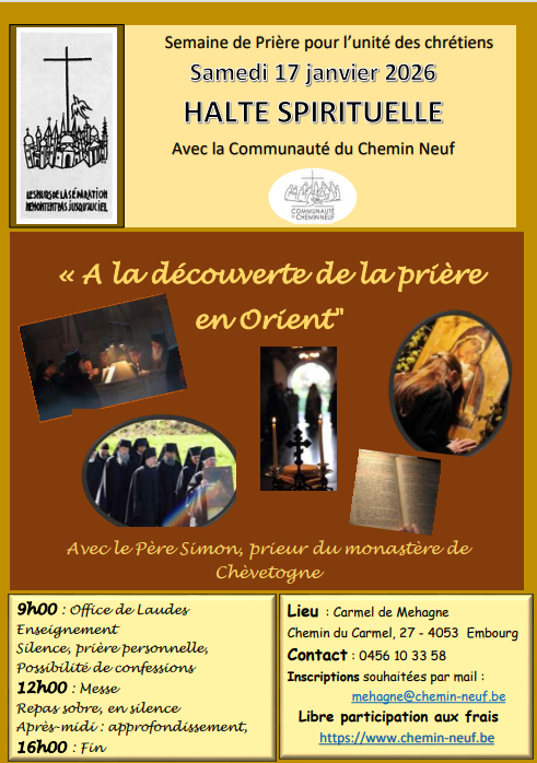 Pour nous introduire à la semaine de prière pour l'unité des chrétiens, la halte spirituelle aura lieu le samedi 17 janvier au Carmel de Mehagne.