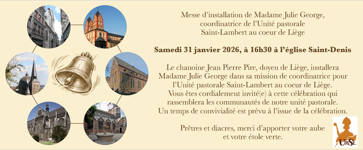 Julie George commence une nouvelle mission en tant que coordinatrice de l’unité pastorale Saint-Lambert au coeur de Liège. À cette occasion, vous êtes invités le samedi 31 janvier 2026 à 16h30 à l’église Saint-Denis (Liège). Le doyen de Liège, le chanoine Jean Pierre Pire, l’installera dans sa nouvelle mission au service de l’unité pastorale Saint-Lambert. Cette messe rassemblera les diverses communautés de l’unité pastorale et sera suivie d’un temps de convivialité.