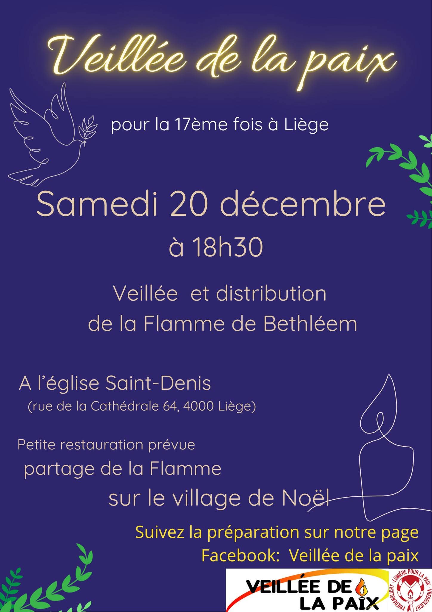 Une veillée de la Paix sera organisée pour un partage de la flamme de la Paix sur Liège et le village de Noël ce samedi 20 décembre, à 18H30, à l'église Saint-Denis rue de la Cathédrale 64 à Liège.