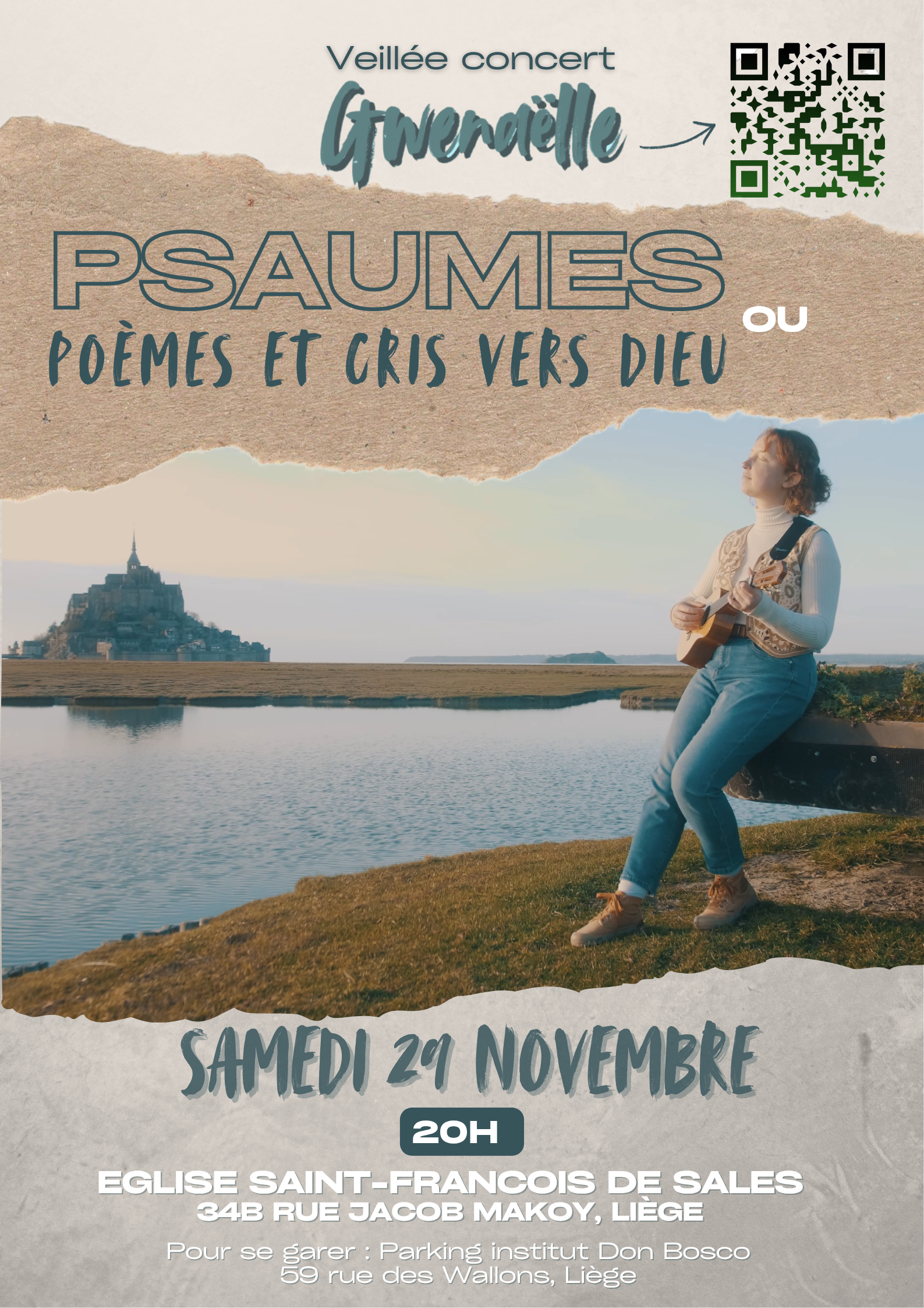 Le temps d’une soirée, Gwenaëlle nous invite à se plonger dans l’univers des psaumes avec ses compositions musicales originales, mais aussi par des reprises connues des communautés chrétiennes. Souvent mal compris et considérés comme désuets, les psaumes ont souvent une réputation peu attrayante. Et pourtant, c’est le pari que fait notre artiste pour une soirée : apprivoiser ces textes plus vieux que Jésus lui-même, et expérimenter comment ils peuvent encore nous parler à l’heure actuelle. A travers ses questionnements, sa musique, et sa relation aux psaumes, Gwenaëlle témoigne comment ces anciens poèmes deviennent, une fois apprivoisés, prières personnelles, puis partage communautaire.