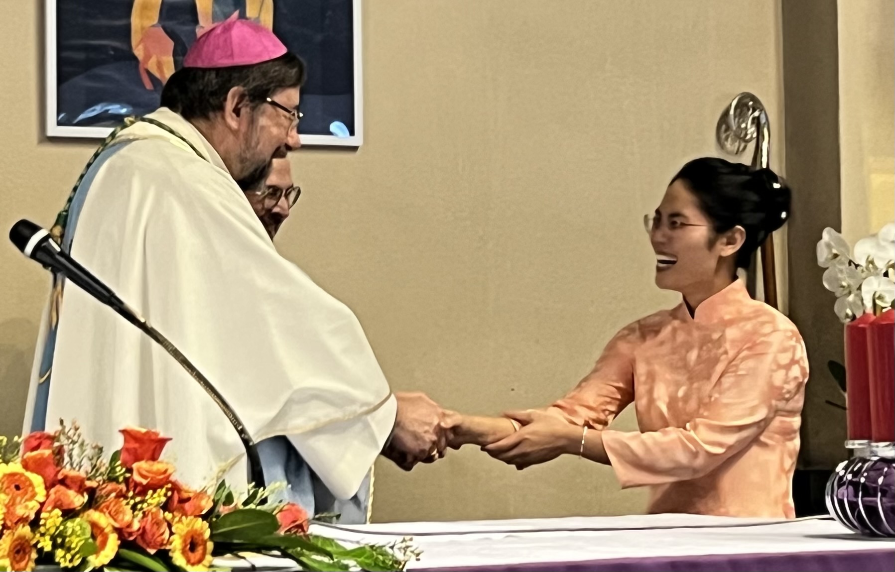 Le jour de la fête de l’Immaculée Conception, à la chapelle du Message au Sanctuaire de Banneux, Thérèsa Nguyên Tuyêt (TMI) - Travailleuse Missionnaire de l’Immaculée - a prononcé son engagement définitif. Notre évêque Mgr Jean-Pierre Delville a souligné d’emblée la grande joie de cet engagement: "C’est une joie pour toutes les communautés, pour nous tous!" Thérèsa est sensible à toute forme d’aide qu’elle peut apporter à son entourage, et elle œuvre notamment en qualité d’aide-soignante au Home Franchimontois à Theux. L’évêque a évoqué "l’importance d’être associé à Marie comme première de cordée", une belle image illustrant le rôle que chacun peut assumer en qualité de pèlerin, toujours en route pour annoncer la bonne parole, le présence du Seigneur, au travail ou au travers de toutes les relations. Comme Marie, Thérèsa a dit OUI.