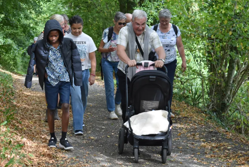 Jacques Boever porte main forte à un landau lors du pèlerinage de l'UP Waimes vers Banneux le 6 septembre 2025