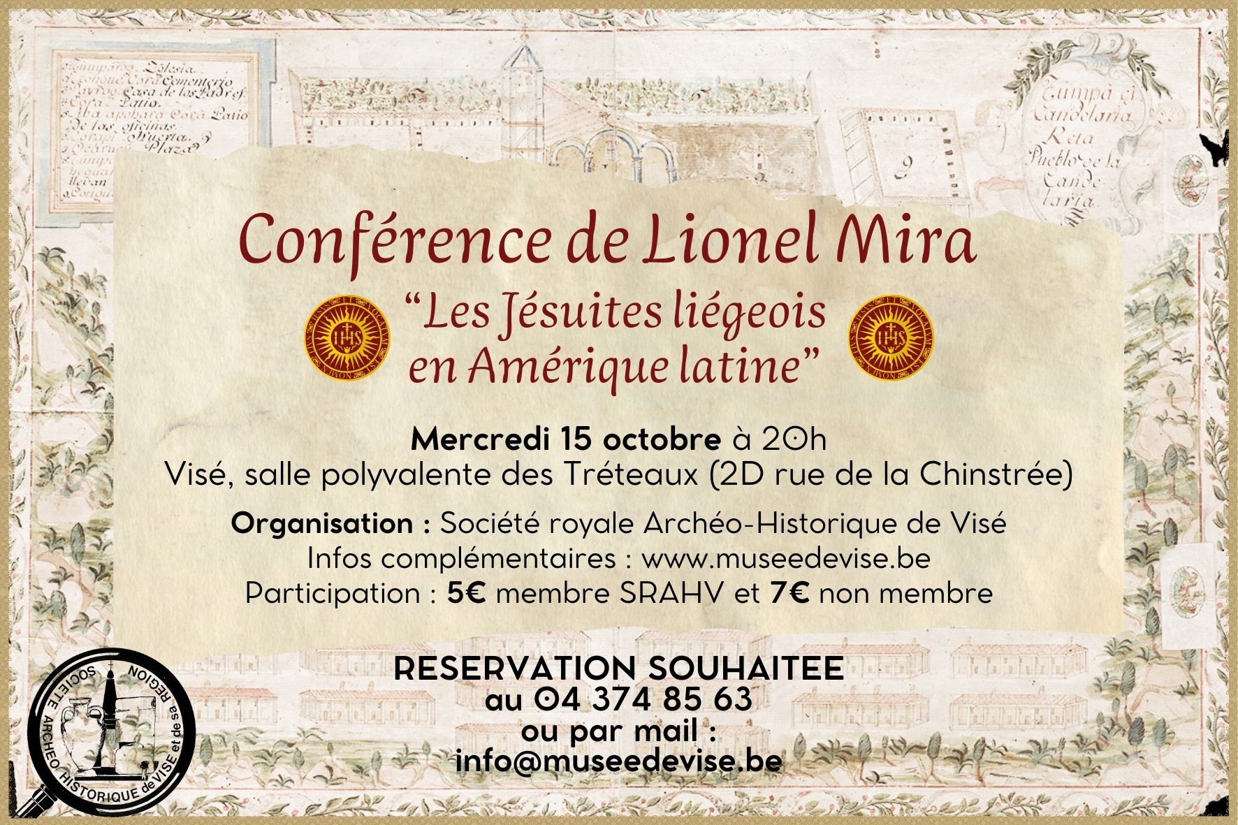 Lionel Mira Torres donnera une conférence sur Les jésuites liégeois en Amérique latine le 15 octobre prochain à la Société Royale Archéo-Historique de Visé (salle polyvalente des Tréteaux, à 20h).