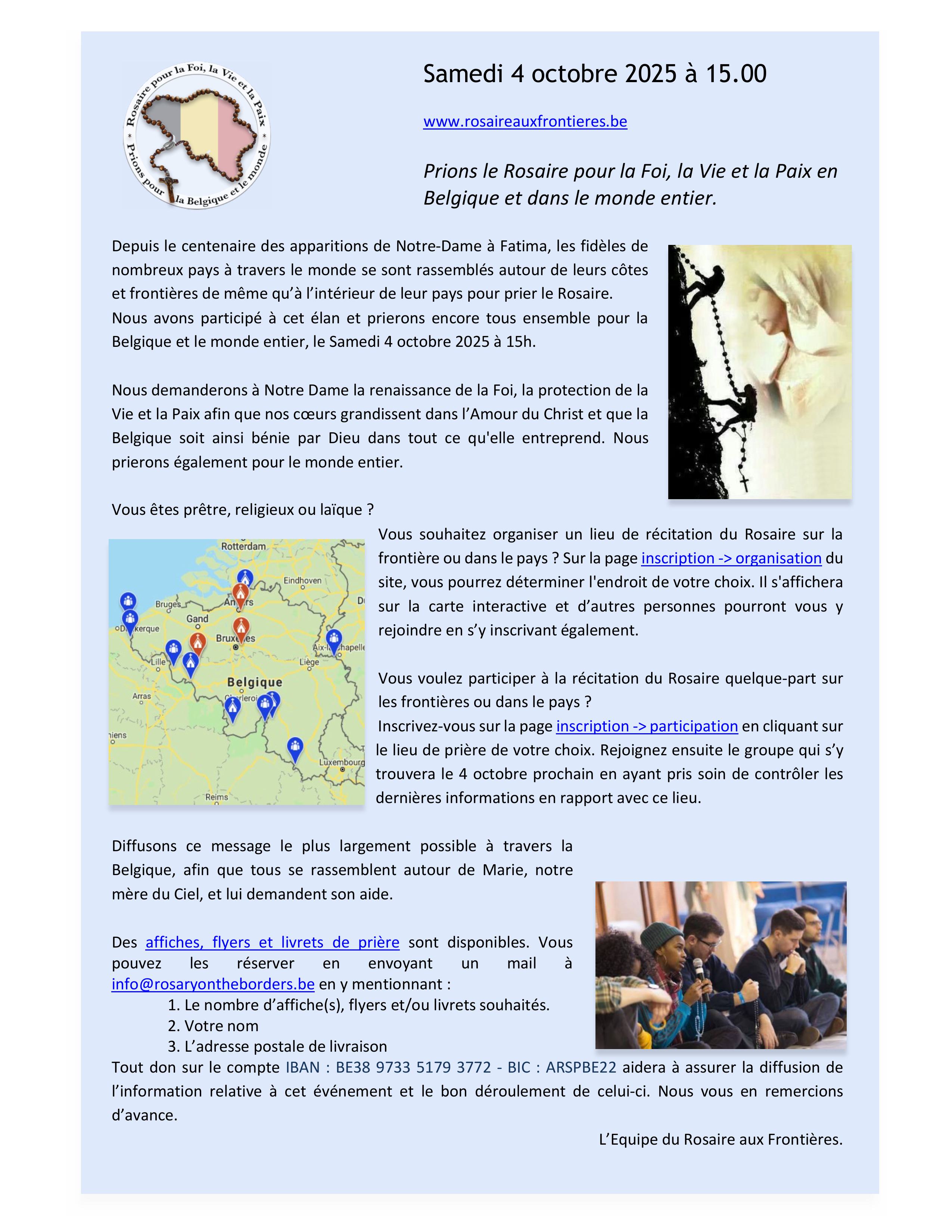 Le samedi 4 octobre, à 15h, vous êtes invités à prier le Rosaire pour la foi, la vie et la paix en Belgique et dans le monde entier.