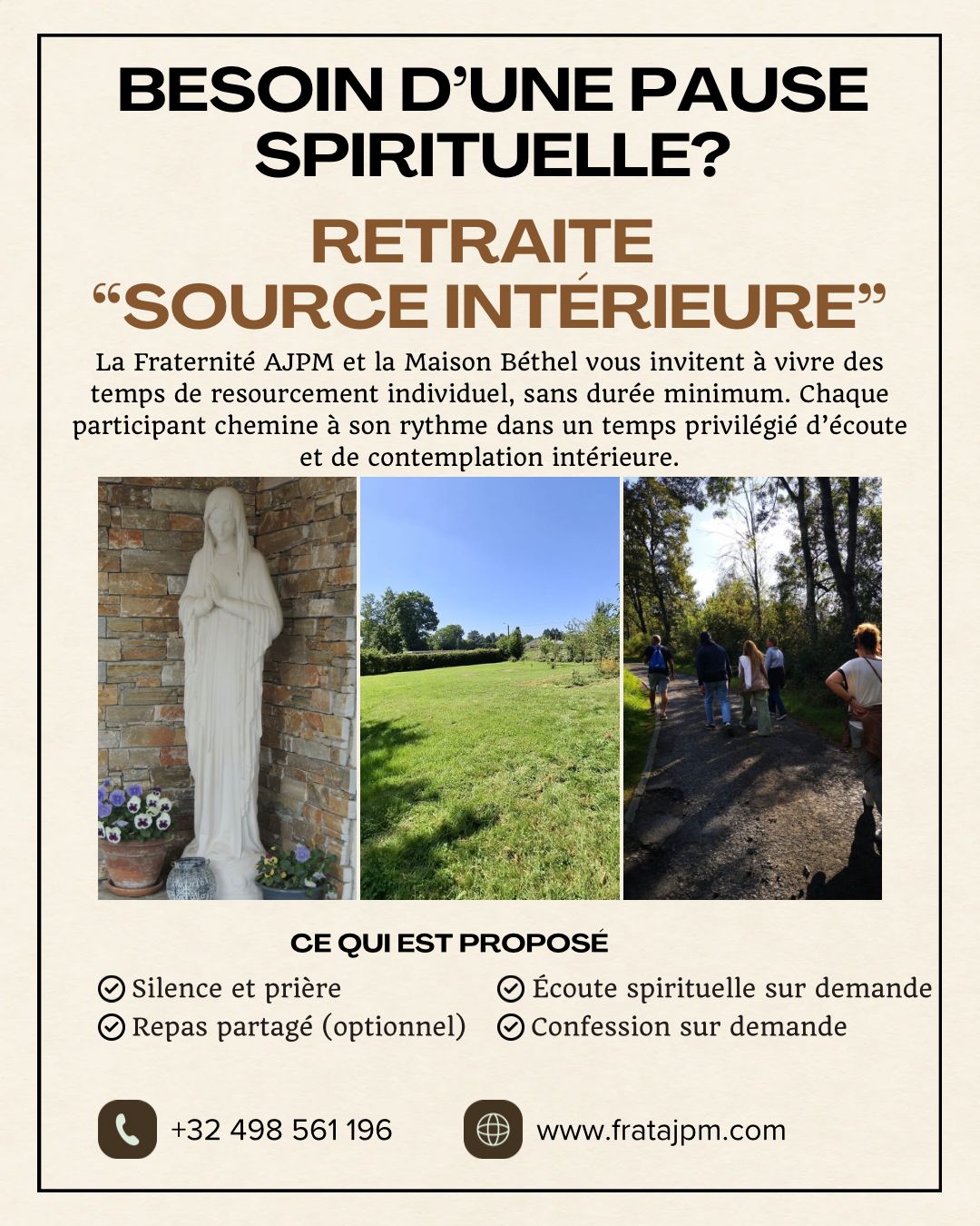 Si vous avez besoin d'une pause spirituelle, la Fraternité AJPM (A Jésus par Marie) et la Maison Béthel vous donnent la possibilité de vivre des temps de ressourcement individuel.